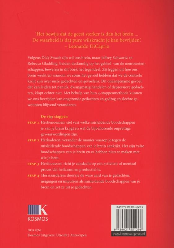 Jeffrey Schwartz & Rebecca Gladding leggen ons uit hoe ons brein werkt en waarom we soms het gevoel hebben dat we de controle kwijt zijn over onze gedachten en gevoelens. Dit onaangename gevoel, dat kan leiden tot paniek, dwangmatig handelen of depressieve gedachten, klopt echter niet. Schwartz en Gladding laten ons zien hoe we in vier stappen het brein weer naar onze hand kunnen zetten en zelf de regie kunnen nemen over ons leven, onze gevoelens