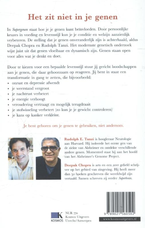 Lang werd aangenomen dat een mens geen invloed heeft op zijn genen: 'Het zit in mijn genen' was een geaccepteerd excuus. Volgens de auteurs Deepak Chopra en Rudolph E. Tanzi is dit achterhaald. Baanbrekend onderzoek laat zien dat verandering in levensstijl en voedingspatroon grote invloed hebben op genetische aanleg voor ziekten en bepaalde fysieke en psychologische gedragingen. Door yoga en meditatie kun je zelfs genetische mutaties bewerkstelligen. Voor de lezer ligt meer geluk en gezondheid in het verschiet.