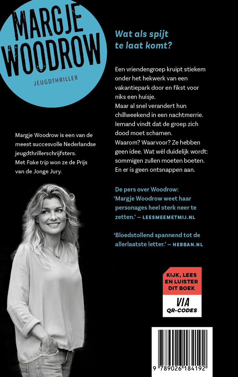 Shame on you is de megaspannende jeugdthriller van Jonge Jury-winnares Margje Woodrow. Bloedstollend tot aan de laatste bladzijdes, inclusief QR-codes: beleef dit verhaal door te lezen, luisteren én kijken. Voor stoere jongens en meiden vanaf 13 jaar. Met politie niet betreden-elastiek.