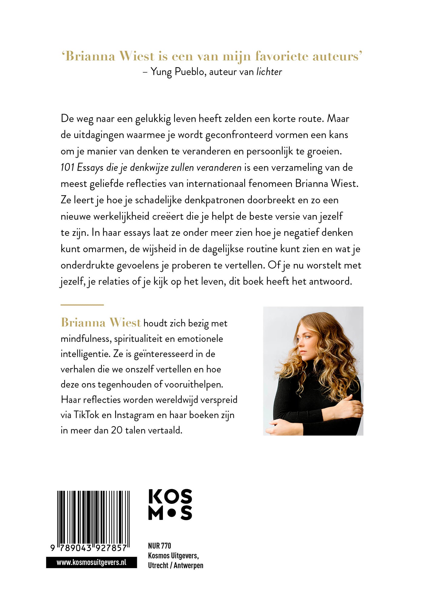 Worstel je weleens met jezelf, relaties of je kijk op het leven? Brianna Wiest helpt je in 101 essays die je denkwijze zullen veranderen op weg in de zoektocht naar jezelf en een nieuw begin. De uitdagingen waarmee we worden geconfronteerd vormen een kans om je manier van denken te veranderen en persoonlijk te groeien. Omdenken lelidt tot bewustwording. Als je leert om bewust de problemen in je leven te zien als een opening om een beter begrip en een betere manier van leven te ontwikkelen, stap je uit het doolhof van lijden en leer je wat het betekent om te bloeien. Ze laat je zien hoe je vanuit leren denken kunt liefhebben, delen, samenleven, geven en creëren. Zo kun je het potentieel waarmee je geboren wordt tot wasdom brengen en de beste versie van jezelf zijn, zowel voor jezelf als de wereld om je heen.