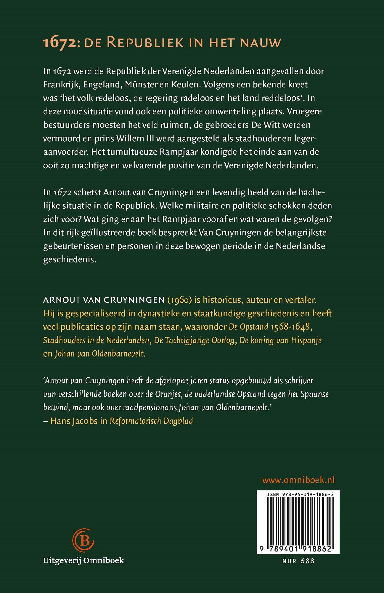 Arnout van Cruyingen beschrijft in ‘1672’ hoe Nederlandse kooplieden grote rijkdom vergaarden door internationale handel, onder meer via de VOC. De zeventiende eeuw is daardoor lang gezien als een Gouden Eeuw. In 1672 leek er voorgoed een einde te worden gemaakt aan de macht en welvaart van de Republiek der Verenigde Nederlanden. Dat jaar vielen vier vijanden, waaronder Engeland en Frankrijk, het land binnen en woekerde de interne strijd tussen de staatsgezinden en prinsgezinden voort. Volgens een populair gezegde was ‘het volk redeloos, de regering radeloos en het land reddeloos’. 350 jaar later schetst Arnout van Cruyningen een levendig beeld van de belangrijkste gebeurtenissen en personen in het rampjaar 1672.