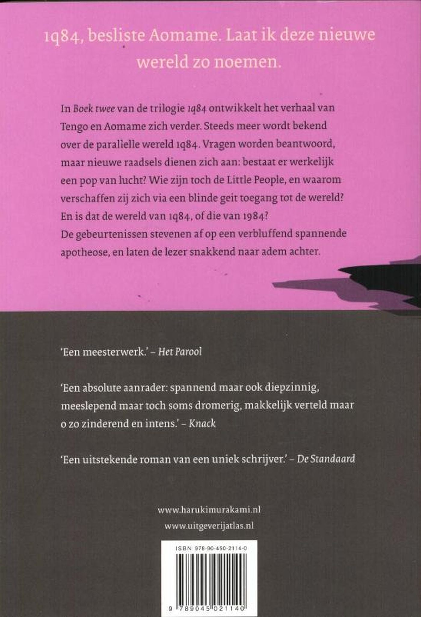 1q84 is het ijzingwekkend spannende verhaal over Aomame en Tengo Steeds meer wordt bekend over de parallelle wereld 1q84. Vragen worden beantwoord, maar nieuwe raadsels dienen zich aan: bestaat er werkelijk een pop van lucht? Wie zijn toch de Little People, en waarom verschaffen zij zich via een blinde geit toegang tot de wereld? En is dat de wereld van 1q84, of die van 1984? In Boek twee ontrafelt het verhaal van Tengo en Aomame zich verder.