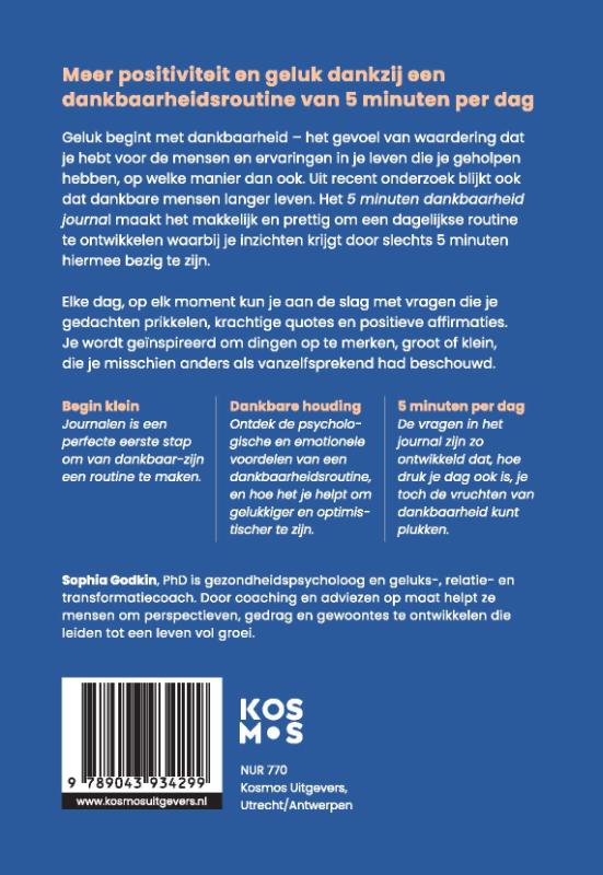 Meer dankbaarheid, positiviteit en geluk in je leven met het ‘5 minuten dankbaarheid journal' van psycholoog en coach Sophia Godkin.