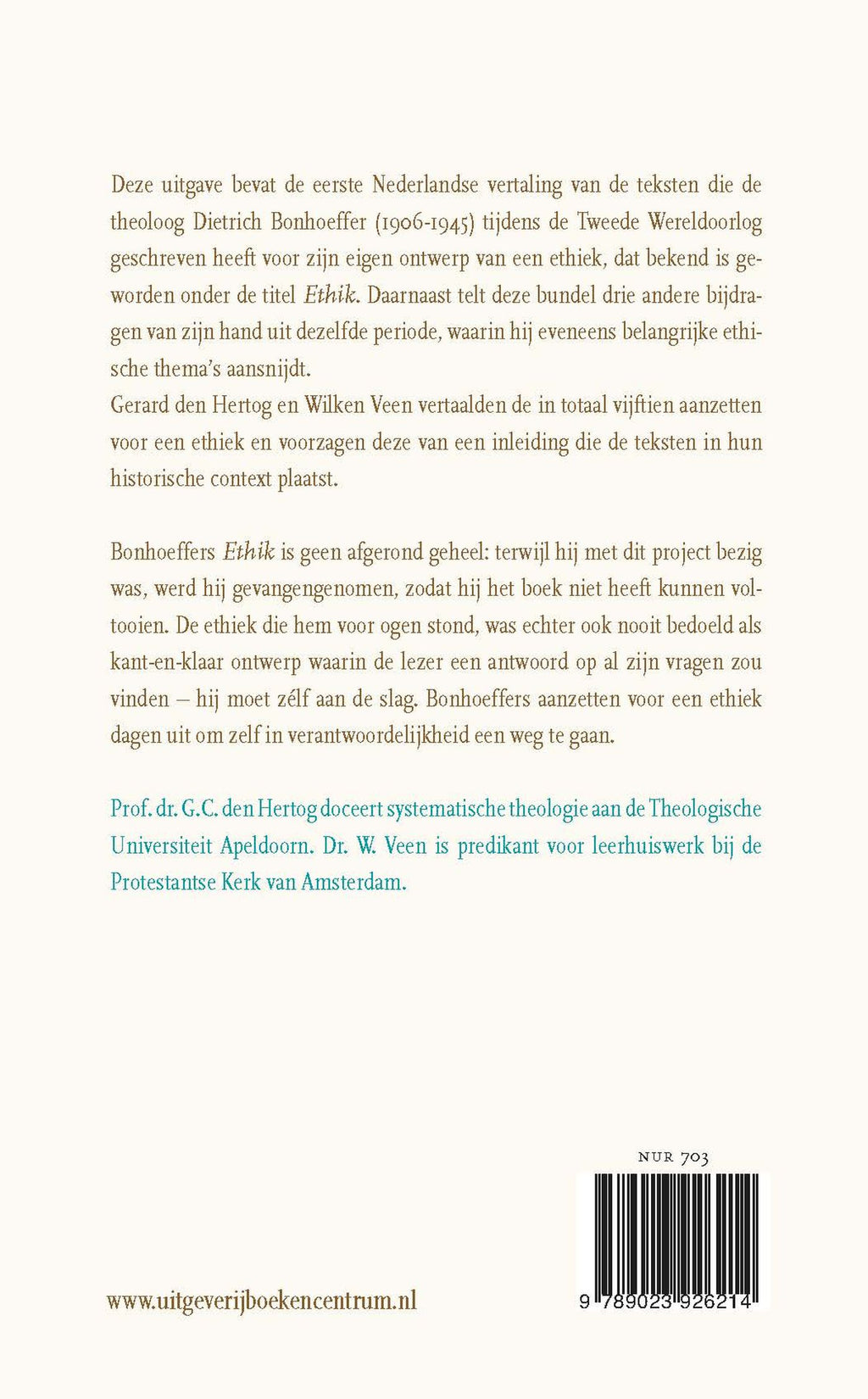 Dietrich Bonhoeffer (1906-1945) werkte tijdens de Tweede Wereldoorlog aan zijn eigen ontwerp van een ethiek. Het project bleef onvoltooid, doordat hij gevangengenomen werd. De ethiek die hem voor ogen stond, was echter ook nooit bedoeld als kant-en-klaar ontwerp waarin de lezer een antwoord op al zijn vragen zou vinden – hij moet zélf aan de slag. Bonhoeffers aanzetten voor een ethiek dagen de lezer daartoe uit. De teksten zijn vertaald en ingeleid door Gerard den Hertog en Wilken Veen.