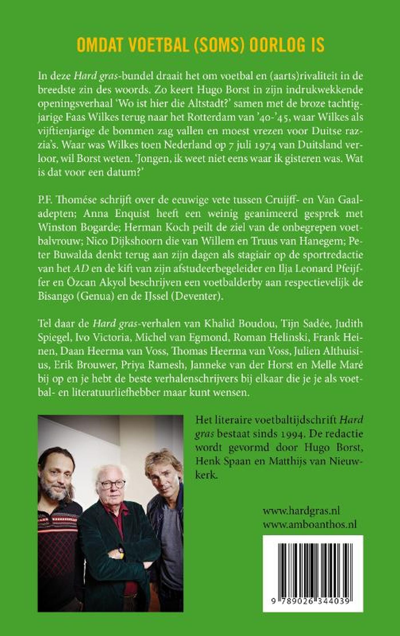 Aartsrivalen is de nieuwe zomerbundel van Hard gras. Geen Oranje op het WK? Niet getreurd! Als pleister op de wonde verzamelde de Hard gras–redactie voor de lange zomer van 2018 de beste verhalen rond het thema ‘aartsrivalen’. Denk aan: Nederland-Duitsland, Feyenoord-Ajax, Barcelona-Madrid, Genoa-Sampdoria, Deventer-Zwolle, Zidane-Materazzi, Messi-Maradona, voetbalhelden in de loopgraven van ’14-’18 en dappere voetbalmoslima’s onder het bewind van ayatollah Khomeini. Met verhalen van sterauteurs van Hard gras ziet de WK-loze zomer er met deze bundel weer een stuk zonniger uit.