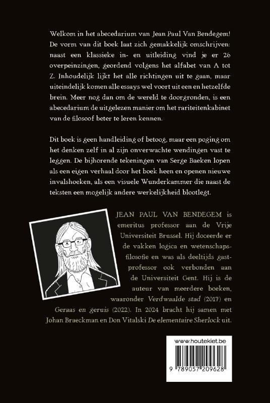 Welkom in het abecedarium van Jean Paul Van Bendegem! De vorm van dit boek laat zich gemakkelijk omschrijven: naast een klassieke in- en uitleiding vind je er 26 overpeinzingen, geordend volgens het alfabet van A tot Z. Inhoudelijk lijkt het alle richtingen uit te gaan, maar uiteindelijk komen alle essays wel voort uit een en hetzelfde brein. Meer nog dan om de wereld te doorgronden, is een abecedarium de uitgelezen manier om het rariteitenkabinet van de filosoof beter te leren kennen.