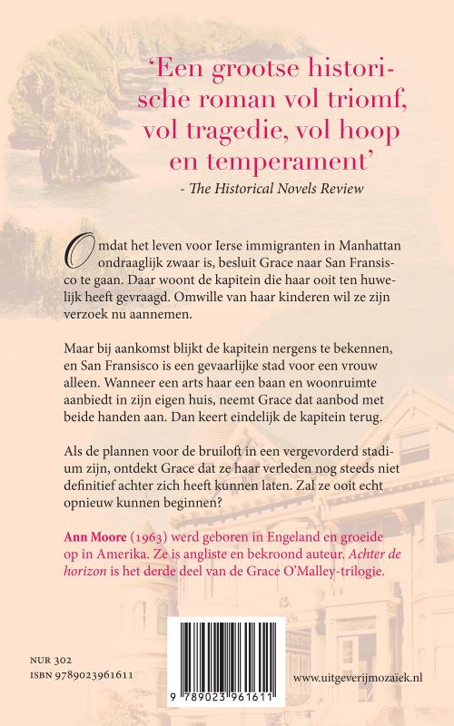 Achter de horizon van Ann Moore is het laatste deel van de Grace O’Malley-trilogie. Omdat het leven voor Ierse immigranten in Manhattan ondraaglijk zwaar is, besluit Grace naar San Fransisco te gaan. Daar woont de kapitein die haar ooit ten huwelijk heeft gevraagd. Omwille van de kinderen wil ze zijn verzoek nu aannemen.