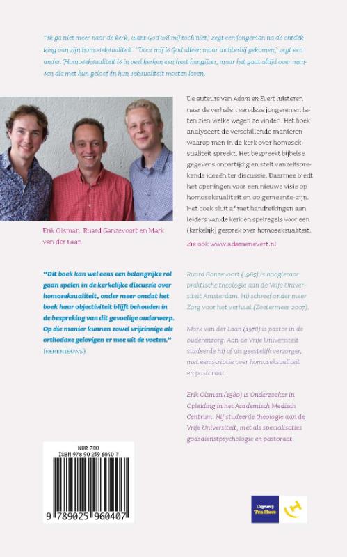 Vaak vinden zijzelf, hun familie, vrienden en predikanten homoseksueel gedrag in strijd met de Bijbel. In Adam en Evert staan de verhalen van christelijke jongeren en hun omgeving centraal. Hoe proberen jonge mensen hun geloof en homoseksualiteit met elkaar te verenigen? Sommigen slagen erin beide met elkaar te verzoenen, anderen leiden een dubbelleven, weer anderen kiezen voor een celibatair leven of verlaten juist de kerk. De auteurs geven aan hoe de omgeving deze jongeren het beste kan steunen in hun zoektocht.