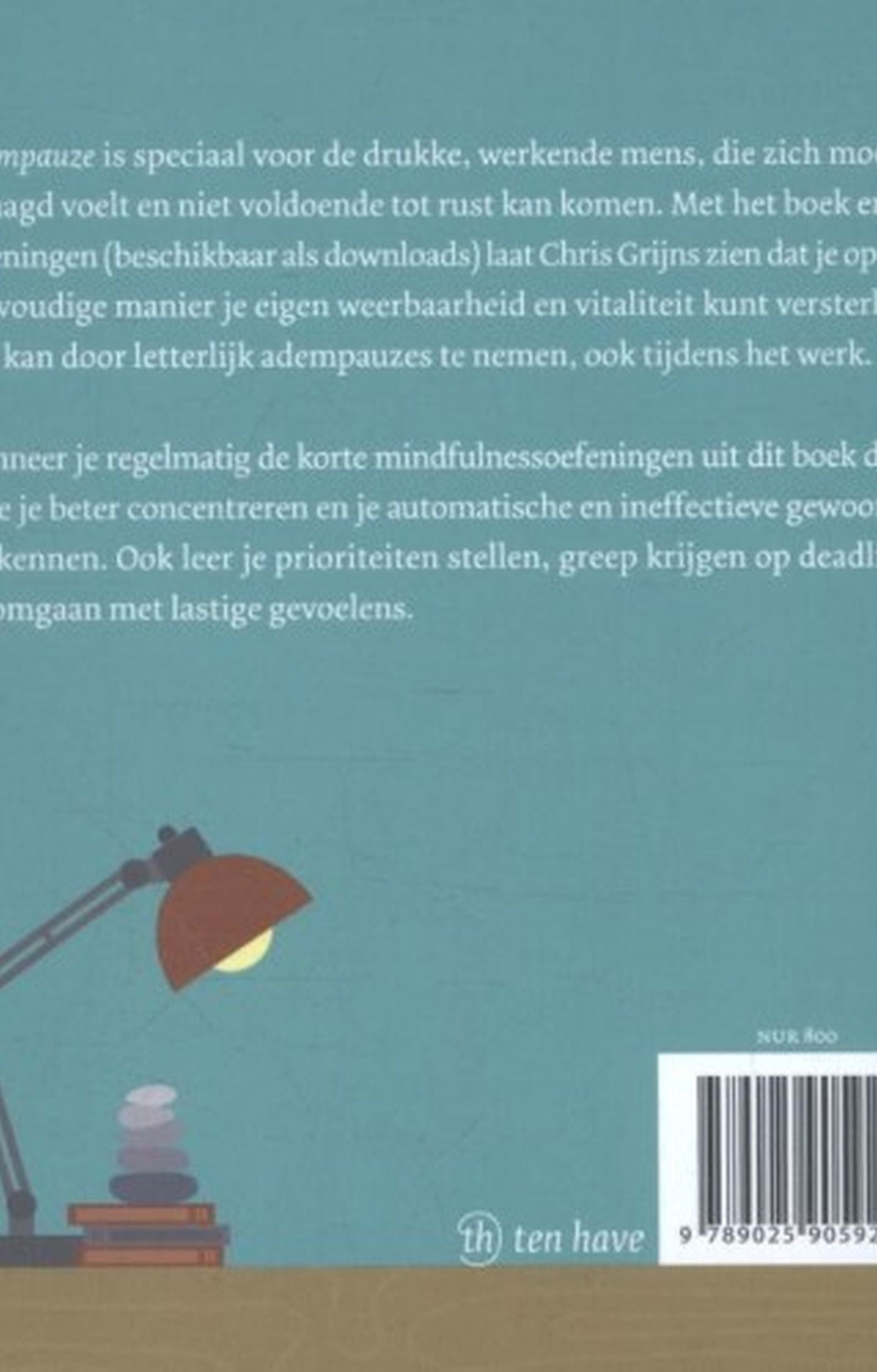 ‘Adempauze’ is speciaal voor de drukke, werkende mens, die zich moe en gejaagd voelt en niet voldoende tot rust kan komen. Met het boek en de oefeningen (beschikbaar als downloads) laat Chris Grijns zien dat je op een eenvoudige manier je eigen weerbaarheid en vitaliteit kunt versterken. Dat kan door letterlijk adempauzes te nemen, ook tijdens het werk.