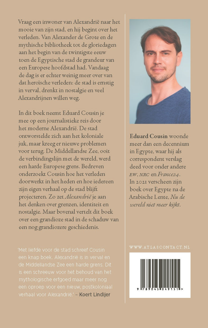 In dit boek neemt Eduard Cousin de lezer mee op een journalistieke reis door de moderne geschiedenis van Alexandrië. De stad ontworstelde zich aan het koloniale juk, maar kreeg er nieuwe problemen voor terug. De Middellandse Zee, ooit de verbindingslijn met de wereld, werd een harde Europese grens. Bedreven onderzoekt Cousin hoe de geschiedenis doorwerkt in het heden en hoe iedereen zijn eigen verhaal op de stad blijft projecteren. Alexandrië is een boek dat je aan het denken zet over culturele grenzen, identiteit en nostalgie. Maar bovenal vertelt het over een grandioze stad in de schaduw van een nog grandiozere geschiedenis.