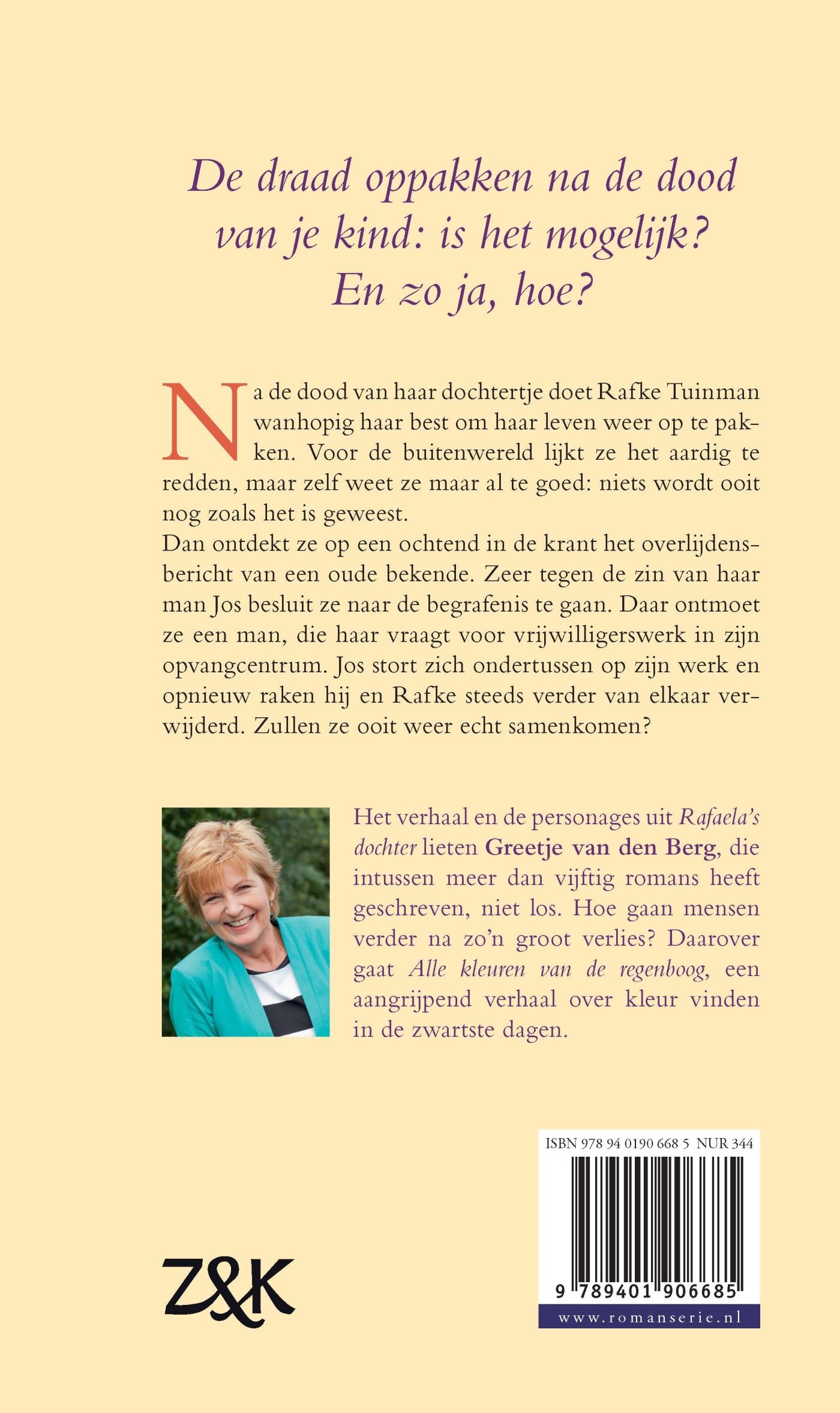 Alle kleuren van de regenboog van Greetje van den Berg is het vervolg op de roman Rafaela’s dochter. Na de dood van haar dochtertje doet Rafke Tuinman wanhopig haar best om haar leven weer op te pakken. Ze gaat terug aan het werk en samen met haar man Jos en zoontje Matthijs besluit ze te verhuizen. Voor de buitenwereld lijkt ze het aardig te redden, maar niets wordt ooit nog hetzelfde. Alle kleuren van de regenboog is een aangrijpende roman over kleur vinden in de zwartste dagen.