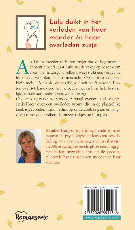 'Alleen van de foto' van Sandra Berg vertelt de aangrijpende familiegeschiedenis van Lulu, die al haar hele leven het gevoel heeft dat ze bij haar moeder op de tweede plaats komt. Haar overleden zus Melanie blijft ruimte innemen, ook al heeft Lulu haar nooit gekend. Haar moeder spreekt ook nooit over haar zusje en alle informatie over haar bestaan lijkt van de aardbodem verdwenen te zijn. Als Lulu's moeder dement wordt, gaat ze voor haar zorgen. Op een dag raakt haar moeder totaal overstuur als ze in de krant leest dat er een overleden vrouw in de plaatselijke beek is gevonden. Wat heeft dit met Melanie te maken? Langzaam maar zeker vallen alle puzzelstukjes op hun plek.