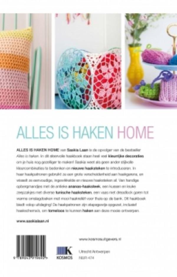 Alles is haken Home van Saskia Laan staat weer boordevol haakontwerpen in vrolijke kleurcombinaties. Ruim 20 haakpatronen; van plaids en kussens tot kleine haakontwerpen om je interieur een creatief tintje te geven. Tomeloos haken tijdens de koude dagen voor elk seizoen! De haakpatronen staan stapsgewijs uitgelegd in woord en beeld met veel mooie sfeerfoto’s. Dit boek is heerlijk om doorheen te bladeren en zorgt er gegarandeerd voor dat je haaknaald niet kunt laten liggen.