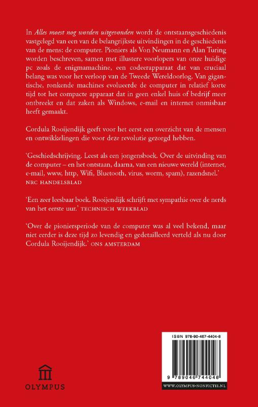 In Alles moest nog worden uitgevonden wordt de ontstaansgeschiedenis vastgelegd van een van de belangrijkste uitvindingen in de geschiedenis van de mens: de computer. Pioniers als Von Neumann en Alan Turing worden beschreven, samen met illustere voorlopers van onze huidige pc zoals de enigmamachine, een codeerapparaat dat van cruciaal belang was voor het verloop van de Tweede Wereldoorlog. Van gigantische, ronkende machines evolueerde de computer in relatief korte tijd tot het compacte apparaat dat in geen enkel huis of bedrijf meer ontbreekt en dat zaken als Windows, e-mail en internet onmisbaar heeft gemaakt.