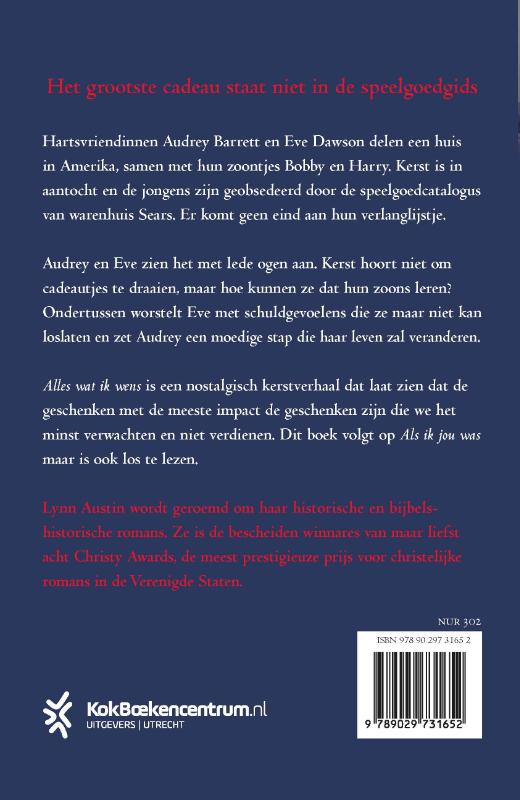Alles wat ik wens van Lynn Austin is een vertederende novelle die verhaalt over de ware betekenis van Kerst. De zoontjes van Eve en Audrey wonen met hun moeders in Amerika en zijn geobsedeerd door alle kerstcadeaus die ze willen hebben. Eve en Audrey zien het met lede ogen aan, want Kerst hoort niet om cadeautjes te draaien. Hoe kunnen ze dat aan hun zoontjes leren? Dit nostalgische kerstverhaal laat zien dat de geschenken met de meeste impact de geschenken zijn die we het minst verwachten en niet verdienen. Alles wat ik wens is een los te lezen vervolg op Als ik jou was.