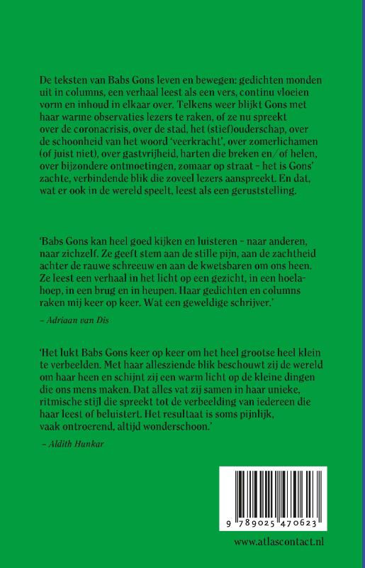 Telkens weer blijkt Babs Gons je met haar warme observaties te raken, of ze nu spreekt over de coronacrisis, over de stad, het (stief)ouderschap, over de schoonheid van het woord ‘veerkracht’, over zomerlichamen (of juist niet), over gastvrijheid, harten die breken en/of helen, over bijzondere ontmoetingen, zomaar op straat – het is haar zachte, verbindende blik die zoveel lezers aanspreekt. En dat, wat er ook in de wereld speelt, leest als een geruststelling.