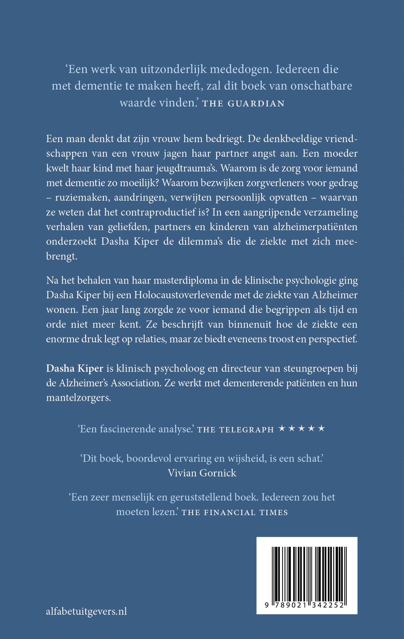 Een man denkt dat zijn vrouw hem bedriegt. De denkbeeldige vriendschappen van een vrouw jagen haar partner angst aan. Een moeder kwelt haar kind met haar jeugdtrauma’s. Waarom is de zorg voor een familielid met dementie zo moeilijk? Waarom bezwijken zorgverleners voor gedrag – ruziemaken, aandringen, verwijten persoonlijk opvatten – waarvan ze weten dat het contraproductief is? In een aangrijpende verzameling verhalen van geliefden, partners en kinderen van alzheimerpatiënten onderzoekt Dasha Kiper de dilemma’s die de ziekte met zich meebrengt.