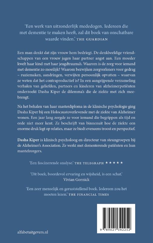 Een man denkt dat zijn vrouw hem bedriegt. De denkbeeldige vriendschappen van een vrouw jagen haar partner angst aan. Een moeder kwelt haar kind met haar jeugdtrauma’s. Waarom is de zorg voor een familielid met dementie zo moeilijk? Waarom bezwijken zorgverleners voor gedrag – ruziemaken, aandringen, verwijten persoonlijk opvatten – waarvan ze weten dat het contraproductief is? In een aangrijpende verzameling verhalen van geliefden, partners en kinderen van alzheimerpatiënten onderzoekt Dasha Kiper de dilemma’s die de ziekte met zich meebrengt.
