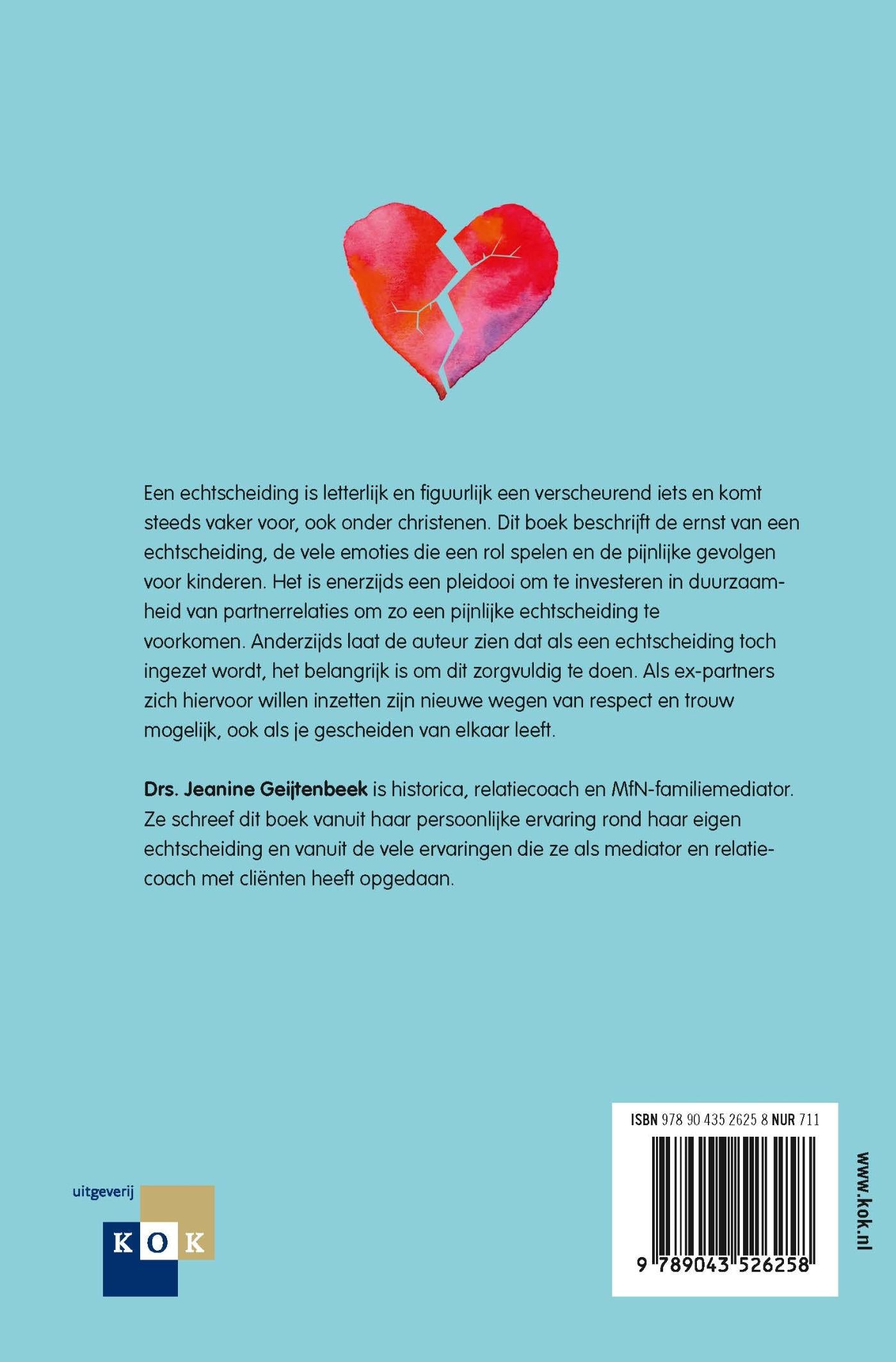In ‘Als het leven ons scheidt’ van Jeanine Geijtenbeek komen de theorie en praktijk bij elkaar. Uit elkaar gaan is hartverscheurend en er spelen veel emoties een rol. Het is belangrijk om na te denken over hoe je uit elkaar gaat, en zo een vechtscheiding te voorkomen. Voor christenen moeten genade en verzoening daarin de hoofdrol spelen. Zodat je in staat bent om jezelf en de ander te aanvaarden, en zo de gevolgen van de scheiding te verzachten. Dit boek bevat veel praktijkvoorbeelden en de auteur benadrukt het belang van communicatie bij relatiecrisis en echtscheiding.