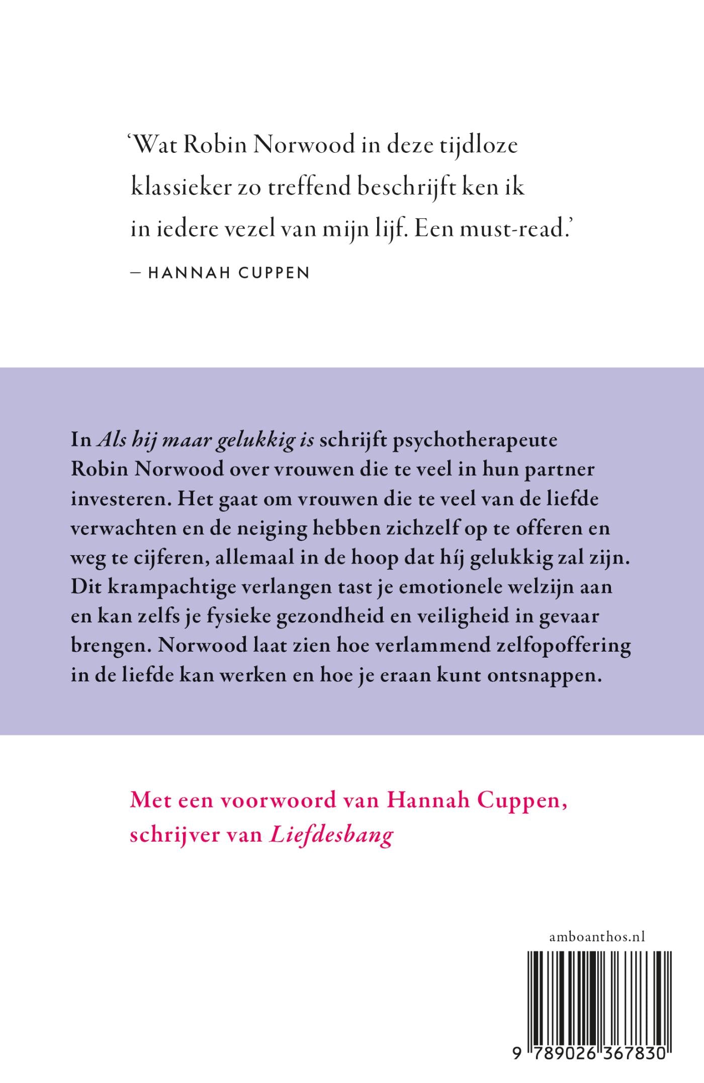 In Als hij maar gelukkig is schrijft psychotherapeute Robin Norwood over vrouwen die te veel in hun partner investeren. Het gaat om vrouwen die te veel van de liefde verwachten en de neiging hebben zichzelf op te offeren en weg te cijferen, allemaal in de hoop dat híj gelukkig zal zijn. Dit krampachtige verlangen tast hun emotionele welzijn aan en kan zelfs hun fysieke gezondheid en veiligheid in gevaar brengen. Robin Norwoord laat in Als hij maar gelukkig is zien hoe verlammend zelfopoffering in de liefde kan werken en hoe je eraan kunt ontsnappen.