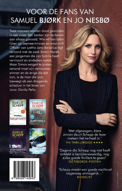 De Zweedse thrillerauteur Emelie Schepp brak in Nederland door met 'Memento'. Dit werd, evenals haar daaropvolgende thrillers, 'Narcotica', 'Post mortem' en 'Postuum' met lovende recensies beoordeeld.