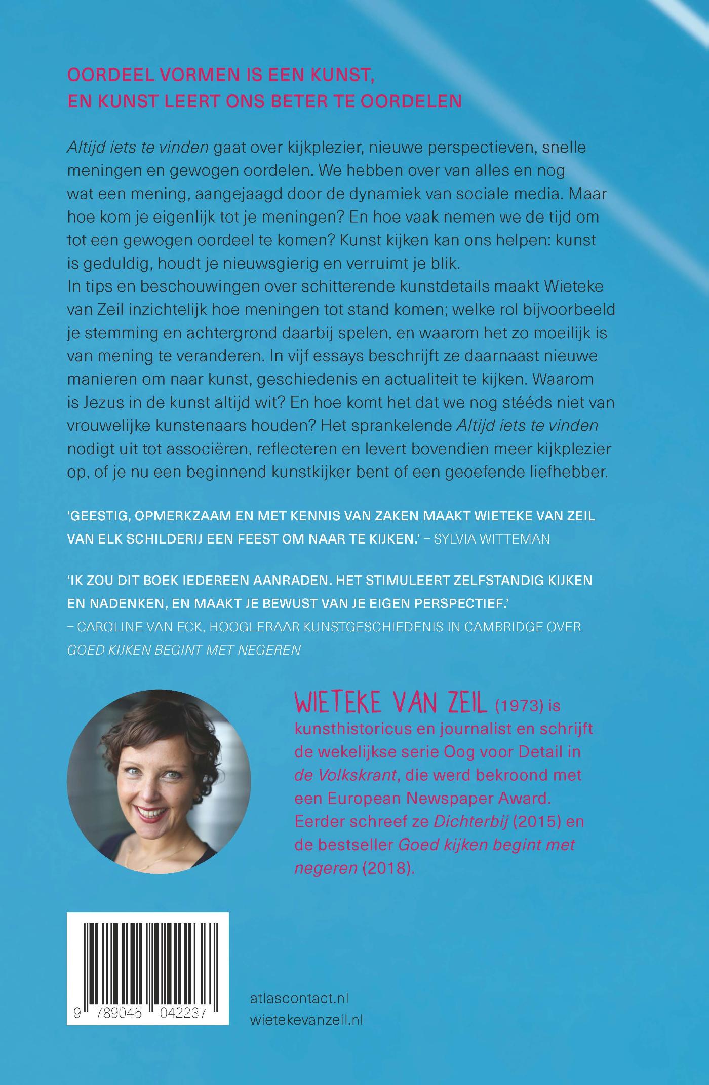 In ‘Altijd iets te vinden’ verkent Wieteke van Zeil de kunst van het vormen van een oordeel op haar kenmerkende manier: detail voor detail. Wie naar kunst kijkt, voelt zich misschien geneigd er meteen iets van te moeten vinden. Maar om iets echt op waarde te schatten, kan het juist helpen je mening even voor je uit te schuiven. Ze geeft tips om tot nieuwe inzichten te komen, waardoor je een gewogen oordeel kunt vormen. Het boek bevat daarnaast zestig associatieve beschouwingen over kunstdetails, die de lezer aanmoedigen zelf onderzoekend te observeren. Want oordeel vormen is een kunst, en kunst kan ons helpen beter te oordelen.