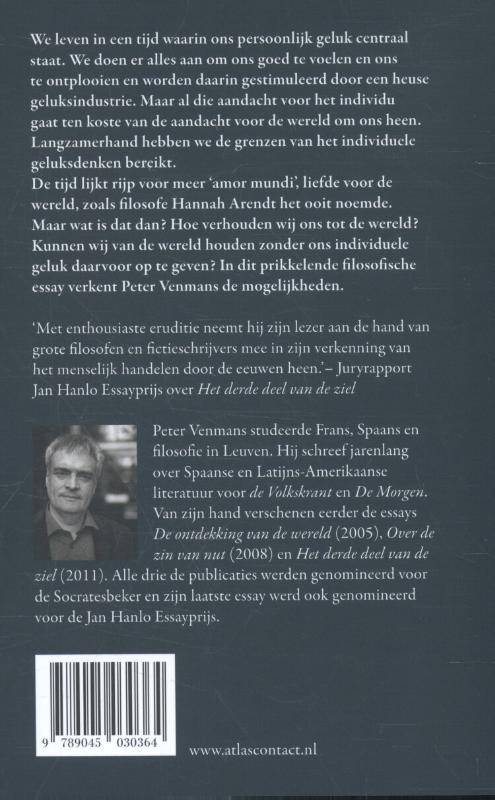 Volgens Peter Venmans lijkt de tijd rijp voor meer 'amor mundi', liefde voor de wereld, zoals filosofe Hannah Arendt het ooit noemde. Maar wat is dat dan? Hoe verhouden wij ons tot de wereld? Kunnen wij van de wereld houden zonder ons individuele geluk daarvoor op te geven? We leven in een tijd waarin ons persoonlijk geluk centraal staat. We doen er alles aan om ons goed te voelen en ons te ontplooien en worden daarin gestimuleerd door een heuse geluksindustrie. Maar al die aandacht voor het individu gaat ten koste van de aandacht voor de wereld om ons heen. Langzamerhand hebben we de grenzen van het individuele geluksdenken bereikt.