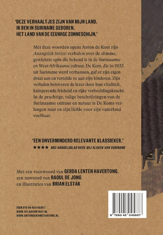 In ‘Anangsieh tories’ geeft Anton de Kom zijn eigen draai aan de sprookjesachtige verhalen over de slimme, gewiekste spin. De Kom, schrijver van het beroemde boek ‘Wij slaven van Suriname’, werd in 1933 uit zijn vaderland Suriname verbannen. In Nederland vertelde hij deze Anangsieh tories aan zijn kinderen. De verhalen betoveren de lezer door hun vitaliteit, knisperende frisheid en rijke verbeeldingskracht. In de prachtige, talige beschrijvingen van de Surinaamse cultuur en natuur is De Koms verlangen naar en zijn liefde voor zijn vaderland voelbaar.