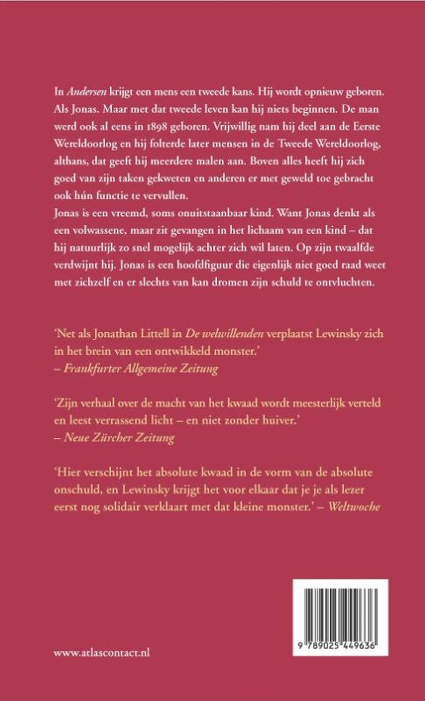 In Charles Lewinsky’s ‘Andersen’ krijgt een mens een tweede kans. Hij wordt opnieuw geboren. Als Jonas. Maar met dat tweede leven kan hij niets beginnen. De man werd ook al eens in 1898 geboren. Vrijwillig nam hij deel aan de Eerste Wereldoorlog en hij folterde later mensen in de Tweede Wereldoorlog, althans, dat geeft hij meerdere malen aan. Boven alles heeft hij zich goed van zijn taken gekweten en anderen er met geweld toe gebracht ook hún functie te vervullen.