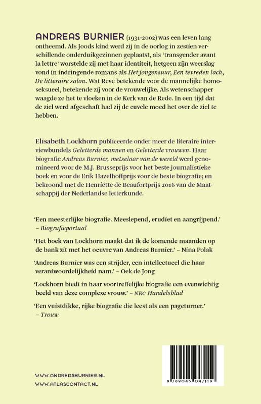In ‘Andreas Burnier, metselaar van de wereld’ laat Elisabeth Lockhorn zien dat Burnier (1931-2002) een leven lang ontheemd was. Als Joods kind werd zij in de oorlog in zestien verschillende onderduikgezinnen geplaatst. Als ‘transgender avant la lettre’ worstelde zij met haar identiteit, hetgeen zijn weerslag vond in indringende romans als ‘Het jongensuur’, ‘Een tevreden lach’ en ‘De litteraire salon’. Wat Reve betekende voor de mannelijke homoseksueel, betekende zij voor de vrouwelijke. Als wetenschapper waagde ze het te vloeken in de Kerk van de Rede. In een tijd dat de ziel werd afgeschaft had zij de euvele moed het over de ziel te hebben.