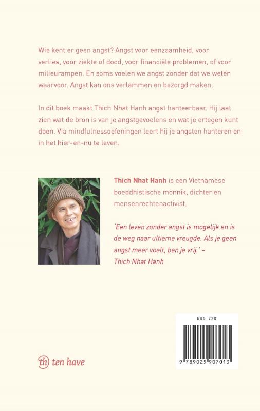 Thich Nhat Hanh laat zien dat erkenning angst hanteerbaar maakt. Angst beheerst het leven van velen: angst voor eenzaamheid, voor verlies, voor ziekte of dood. Angst verlamt, en daarom duwen we deze emotie het liefst ver weg. Zijn aanpak: spoor de oorsprong van deze negatieve emotie op, en leer los te laten. Zo kun je alle vormen van angst het hoofd bieden. De mindfulnessoefeningen die Thich Nhat Hanh aanreikt, helpen daarbij.