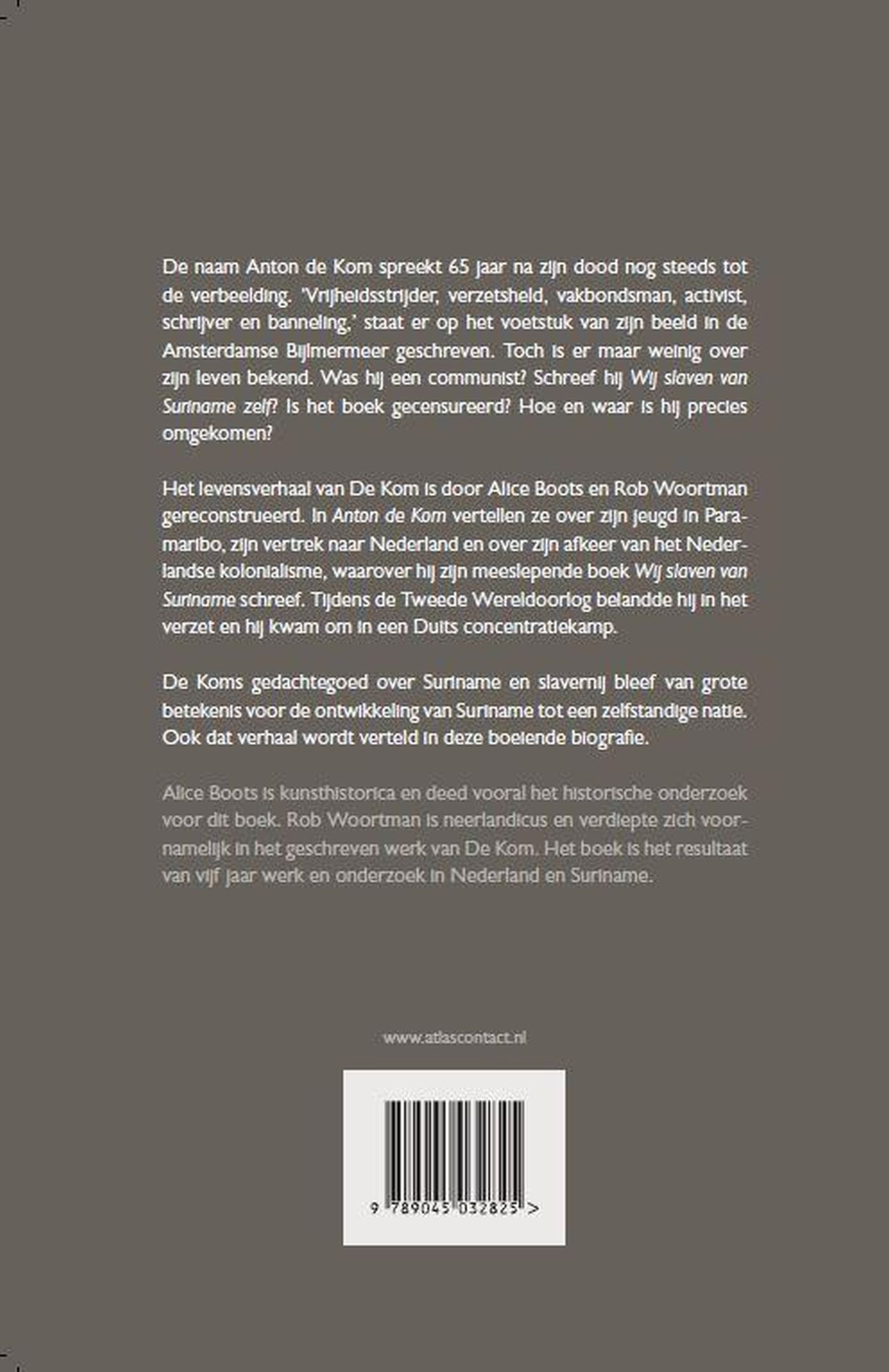 Het levensverhaal van De Kom is door Alice Boots en Rob Woortman gereconstrueerd. In Anton de Kom vertellen ze over zijn jeugd in Paramaribo, zijn vertrek naar Nederland en zijn afkeer van het Nederlandse kolonialisme, waarover hij zijn meeslepende boek Wij slaven van Suriname schreef. Tijdens de Tweede Wereldoorlog belandde hij in het verzet en hij kwam om in een Duits concentratiekamp.