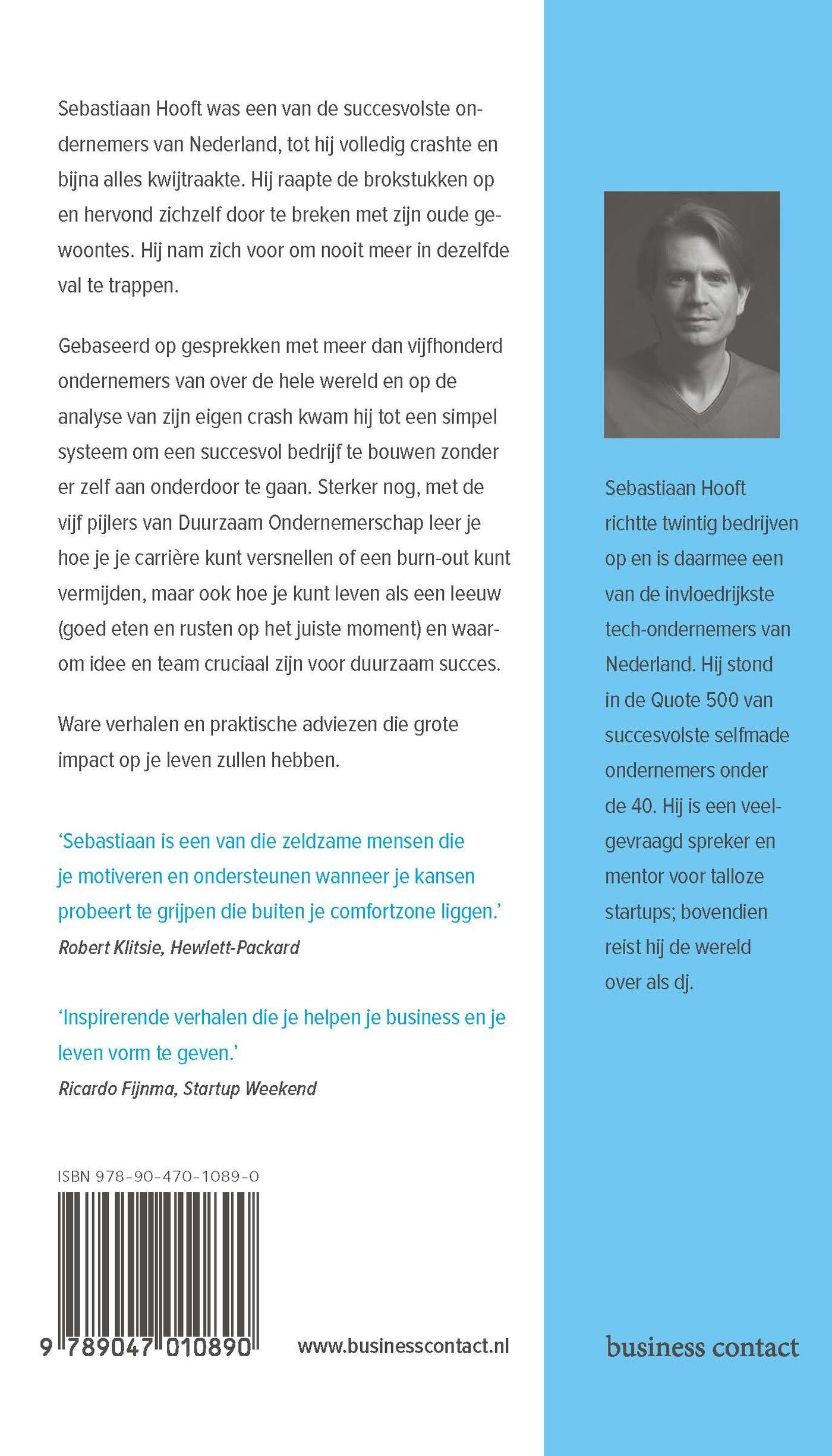 Gebaseerd op gesprekken met meer dan vijfhonderd ondernemers van over de hele wereld en op de analyse van zijn eigen crash kwam hij tot een simpel systeem om een succesvol bedrijf te bouwen zonder er zelf aan onderdoor te gaan. Sterker nog, met de vijf pijlers van Duurzaam Ondernemerschap leer je hoe je je carrière kunt versnellen of een burn-out kunt vermijden, maar ook hoe je kunt leven als een leeuw (goed eten en rusten op het juiste moment) en waarom idee en team cruciaal zijn voor duurzaam succes.
