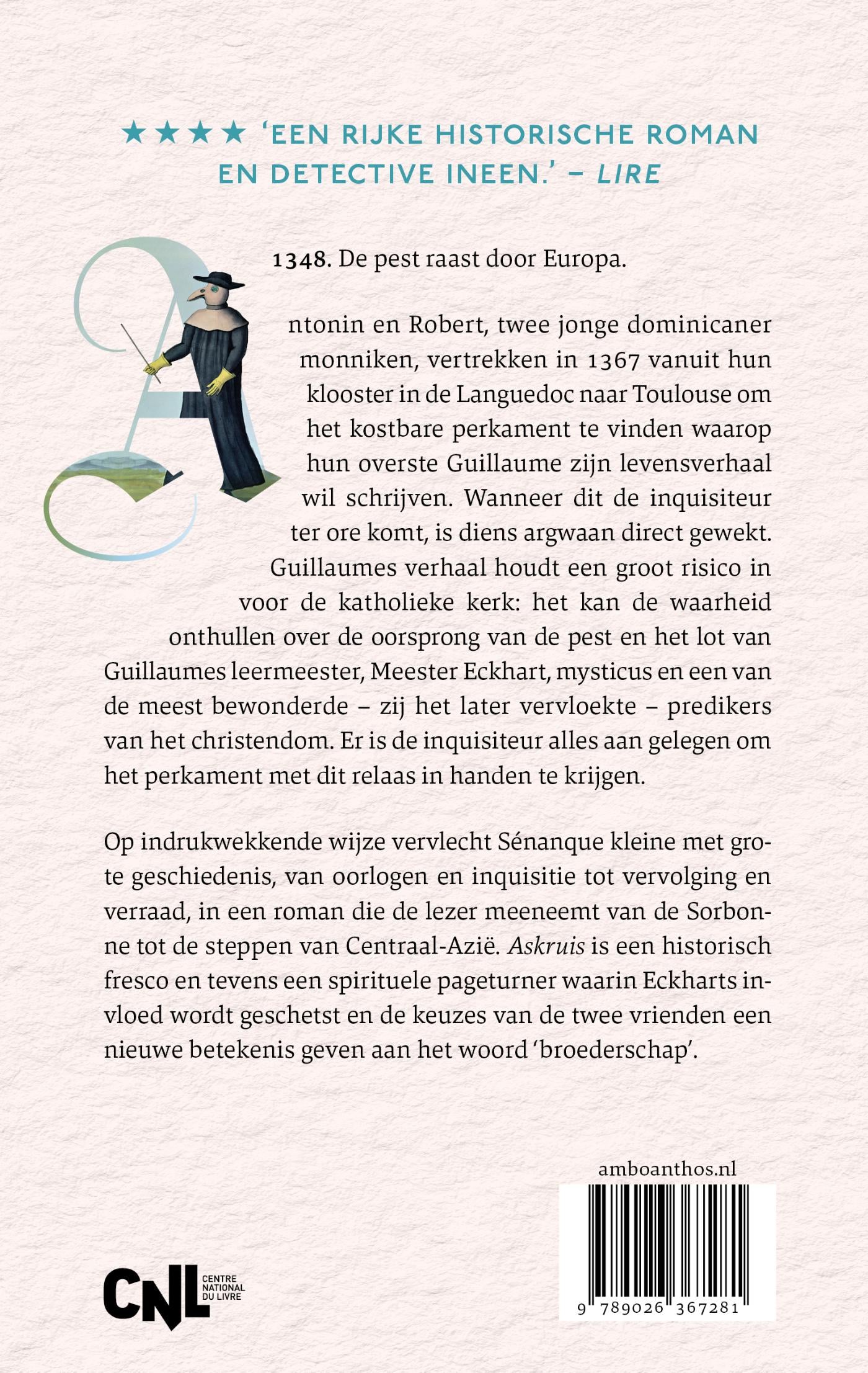 Askruis is een historisch fresco maar ook een spirituele en dramatische pageturner waarin Eckharts woorden en de keuzes van onze twee hoofdpersonen een nieuwe betekenis geven aan het woord ‘broederschap’.
