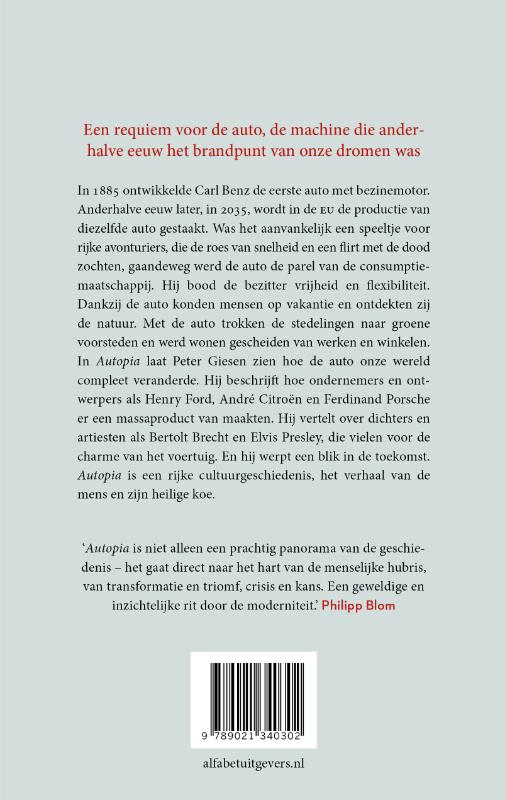 Was het aanvankelijk vooral een speeltje voor rijke avonturiers die de roes van snelheid en een flirt met de dood zochten, gaandeweg werd de auto de parel van de consumptiemaatschappij. Hij bood de bezitter vrijheid en flexibiliteit. Dankzij de auto konden mensen op vakantie en ontdekten zij de natuur. Met de auto trokken de stedelingen naar groene voorsteden. Wonen werd gescheiden van werken en winkelen, de sociaal gemengde stad maakte plaats voor bubbels van hoger- en lageropgeleiden. Alleen autobezitters namen deel aan de moderne tijd. In ‘Autopia’ laat Peter Giesen zien hoe de auto onze wereld compleet veranderde. Hij beschrijft hoe ondernemers en ontwerpers als Henry Ford, André Citroën en Ferdinand Porsche er een massaproduct van maakten. Hij vertelt over dichters en artiesten als Bertolt Brecht en Elvis Presley, die vielen voor de charme van het voertuig. En hij werpt een blik in de toekomst. Peter Giesen schrijft een requiem voor de auto met verbrandingsmotor, de machine die anderhalve eeuw het brandpunt van onze dromen was.