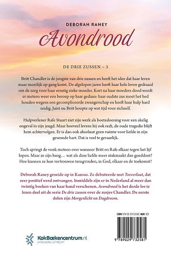 Avondrood van Deborah Raney vertelt het verhaal van Britt, de jongste van drie zussen. De afgelopen jaren heeft haar hele leven gedraaid om de mantelzorg voor haar ernstig zieke moeder. Nu haar moeder is overleden, denkt ze eindelijk tijd te krijgen voor zichzelf. Maar dan moet Britts oudste zus Phee bed houden wegens een gecompliceerde zwangerschap en opnieuw wordt Britts hulp ingeroepen.