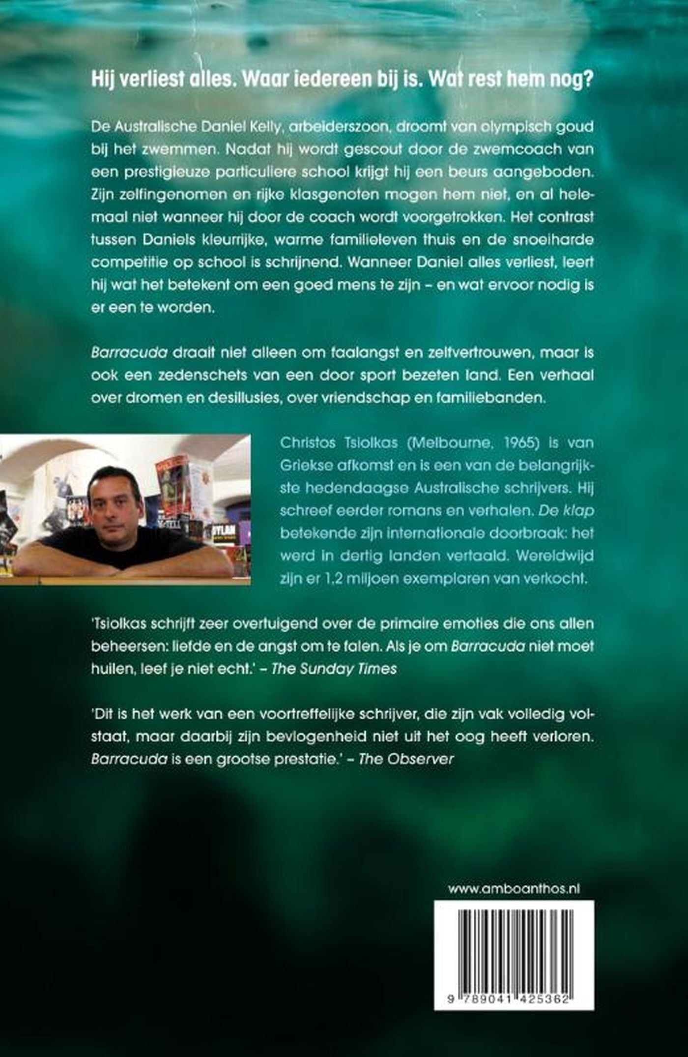In het boek Barracuda van Christos Tsiolkas droomt Daniel Kelly, afkomstig uit een arbeiderswijk in Melbourne, Australië, van olympisch goud bij het zwemmen. Nadat hij wordt gescout door de zwemcoach van een prestigieuze particuliere school krijgt hij een beurs aangeboden. Maar zijn zelfingenomen en rijke klasgenoten mogen hem niet. Het contrast tussen Daniels kleurrijke, warme familieleven thuis en de snoeiharde competitie op school is schrijnend. Wanneer Daniel, ook wel Barracuda genaamd, alles verliest, leert hij wat het betekent om een goed mens te zijn en wat er voor nodig is er een te worden.