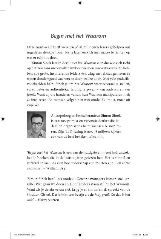 Toch sneeuwt bij veel bedrijven het Waarom nogal eens onder in de hectiek van de dag. Begin met het Waarom helpt je om het Waarom weer centraal te stellen en zo beter en authentieker leiding te geven en je omgeving te inspireren. Met veel voorbeelden uit de praktijk toont Simon Sinek aan dat het werkt.