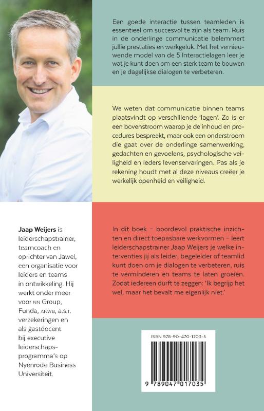 In dit boek beschrijft de ervaren leiderschapstrainer Jaap Weijers het impactvolle en zeer praktisch toepasbare model van de 5 interactielagen. Hierdoor word je je bewust van de gelaagdheid in alle gesprekken die je voert én leer je sterke teams te bouwen. Als leider, begeleider of teamlid leer je welke interventies je kunt doen om je dialogen te verbeteren en je teams te laten groeien. Voor iedereen die zelf aan de slag wil met praktische inzichten en direct toepasbare werkvormen om inspirerend leiding te geven aan teams.