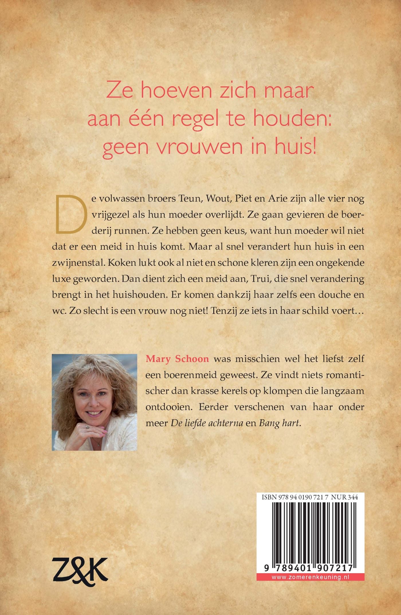 Belofte aan een moeder van Mary Schoon is een streekroman met pit. Centraal staan vier broers, type rouwdouwer, die hun moeder op haar sterfbed beloven om nooit aan de vrouw te gaan. Sterker nog, ze zullen niet eens een dienstmeid in huis halen. Een onmogelijke belofte: ze zijn toch geen monniken! Dat kan natuurlijk alleen maar misgaan. Mary Schoon schrijft met veel liefde over het boerenleven. Eigenlijk zou ze het allerliefst zelf een boerenmeid willen zijn. Aangezien dat niet kan, schrijft ze erover. Dat doet ze met zo veel verve dat je haast zou denken dat ze het tóch zelf heeft meegemaakt. Het maakt Belofte aan een moeder een lekker wegleesboek waarin je je even echt in de tijd van toen waant.