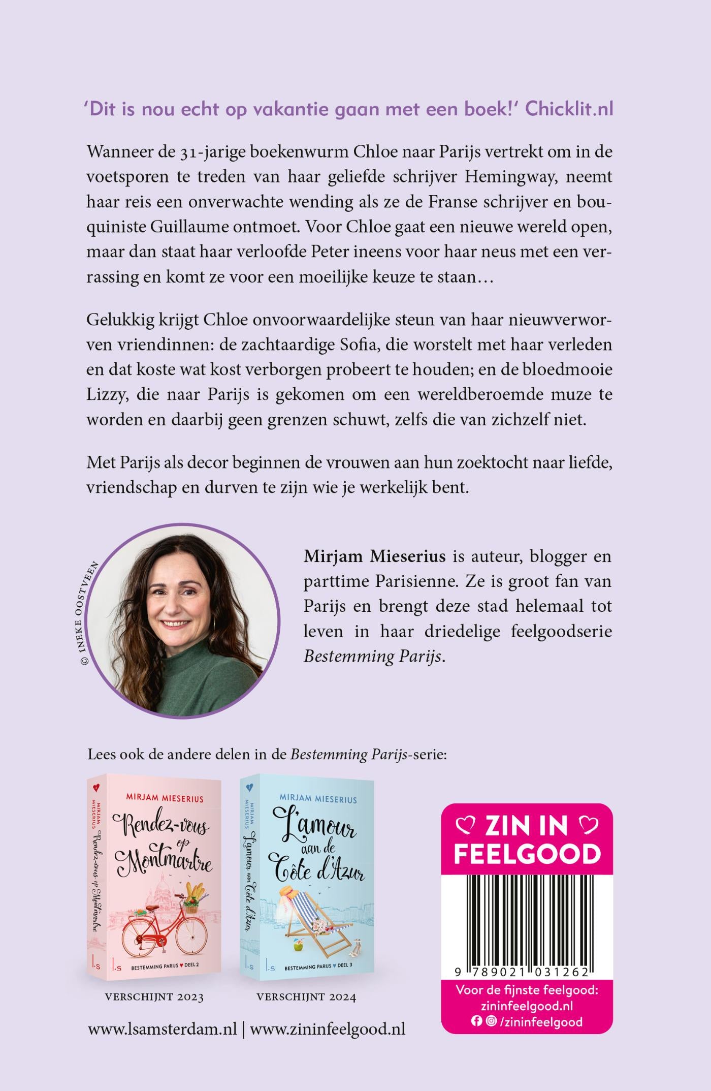 In Bestemming Parijs van Mirjam Mieserius vertrekt de 31-jarige boekenwurm Chloe naar Parijs om in de voetsporen te treden van haar geliefde Hemingway. Haar reis neemt echter een onverwachte wending als ze de Franse schrijver en bouquiniste Guillaume ontmoet. Voor Chloe gaat een nieuwe wereld open, maar dan staat haar verloofde Peter ineens voor haar neus met een verrassing en komt ze voor een moeilijke keuze te staan…