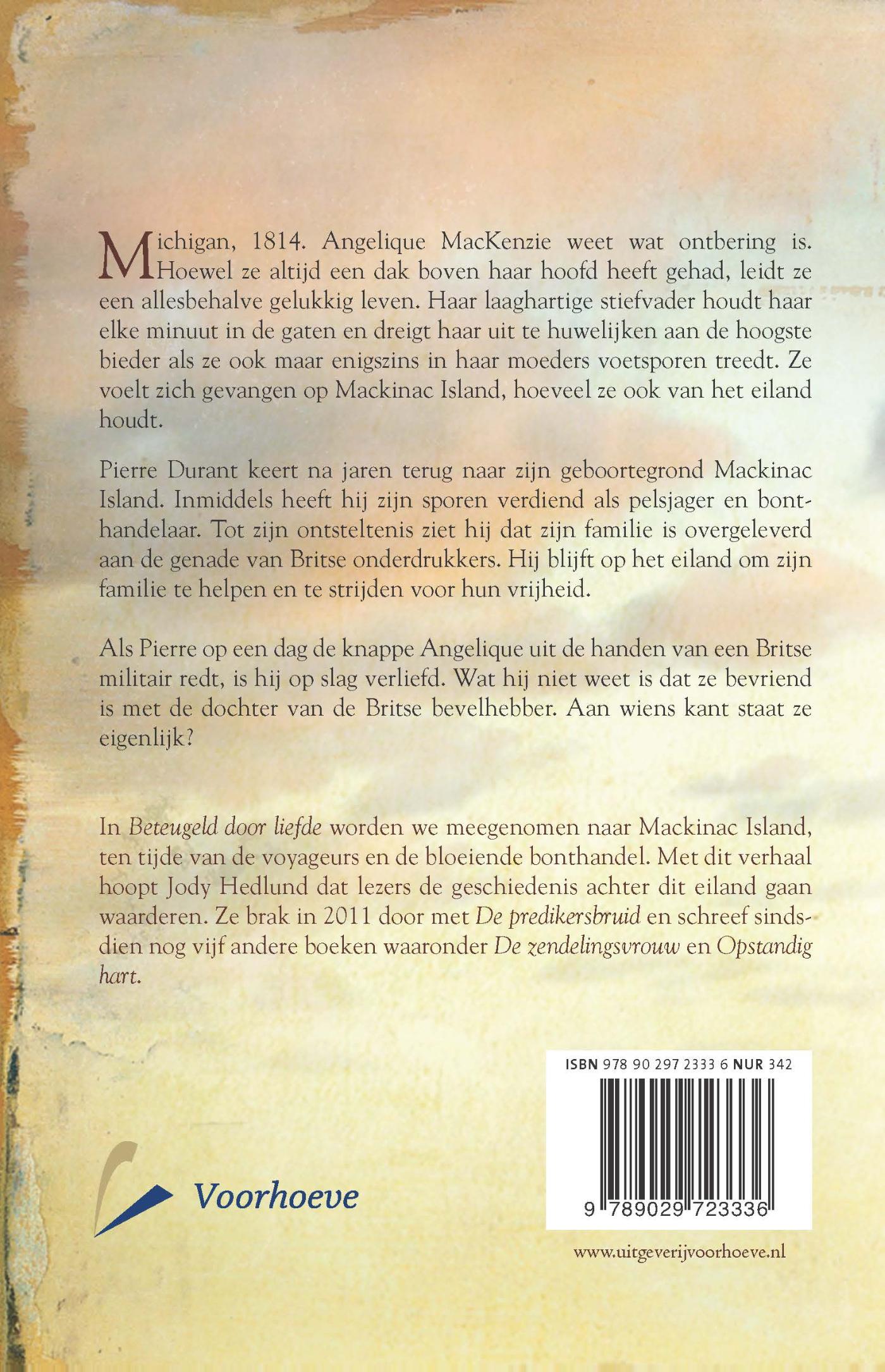 In `Beteugeld door liefde plaatst schrijfster Jody Hedlund haar personages voor een dilemma. Kiezen ze voor hun liefde of voor hun land? 1814, Michigan. Handelaar Pierre Durant keert na jaren terug naar zijn geboortegrond Mackinac Island. Tot zijn ontsteltenis ziet hij dat zijn familie is overgeleverd aan de genade van Britse onderdrukkers. Hij blijft op het eiland om zijn familie te helpen en te strijden voor hun vrijheid. Op een dag ontmoet hij de knappe Angelique Labelle en wordt op slag verliefd. Wat hij niet weet is dat ze goed bevriend is met de dochter van de Britse bevelhebber. Aan wiens kant staat ze eigenlijk?