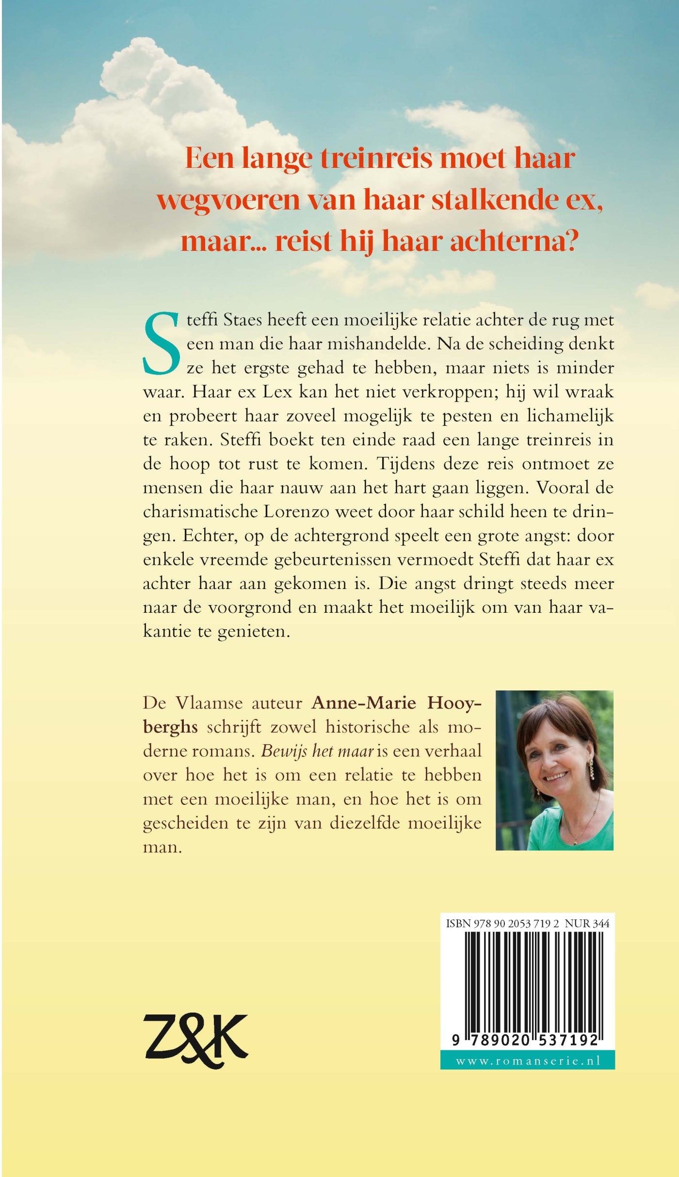 Steffi Staes, de hoofdpersoon in 'Bewijs het maar' van Anne-Marie Hooyberghs, heeft een moeilijke relatie achter de rug met een man die haar mishandelde. Na de scheiding denkt ze het ergste gehad te hebben, maar niets is minder waar. Haar ex Lex kan het niet verkroppen; hij wil wraak en probeert haar zoveel mogelijk te pesten en lichamelijk te raken. Steffi boekt ten einde raad een lange treinreis in de hoop tot rust te komen. Tijdens deze reis ontmoet ze mensen die haar nauw aan het hart gaan liggen. Vooral de charismatische Lorenzo weet door haar schild heen te dringen. Echter, op de achtergrond speelt een grote angst: door enkele vreemde gebeurtenissen vermoedt Steffi dat haar ex achter haar aan gekomen is. Die angst dringt steeds meer naar de voorgrond en maakt het moeilijk om van haar vakantie te genieten. Anne-Marie Hooyberghs bewijst met 'Bewijs het maar' haar schrijverschap en vertelkunst.