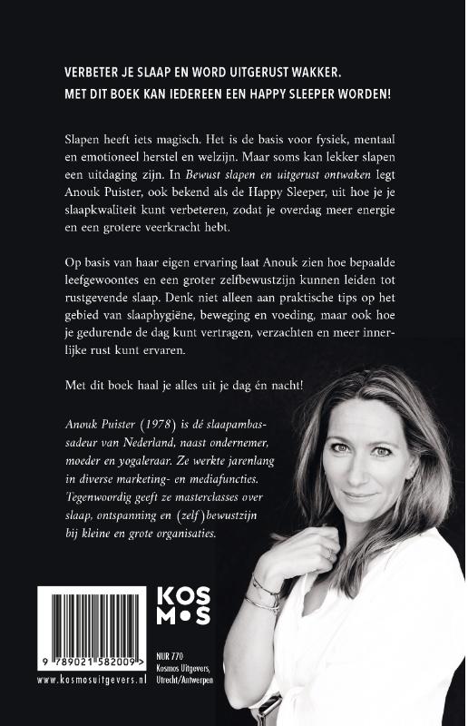 Anouk Puister a.k.a. de Happy Sleeper deelt kennis uit de wetenschap, oefeningen uit oude wijsheden en tradities. Op basis van haar eigen ervaring beschrijft ze hoe bepaalde leefgewoontes en een groter zelfbewustzijn kunnen leiden tot rustgevende slaap en uitgerust wakker worden. Denk niet alleen aan praktische tips op het gebied van slaaphygiëne, beweging en voeding, maar ook hoe je gedurende de dag kunt vertragen, verzachten en meer innerlijke rust kunt ervaren. Anouk wil mensen motiveren om weer contact te maken met de signalen van onrust en het eigen lichaam om zo zelf de regie te kunnen nemen over dag en nacht.