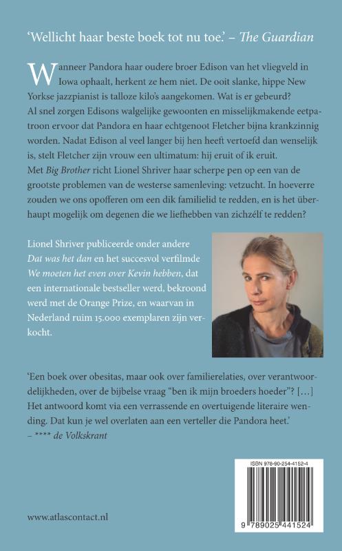 Met Big Brother richt Lionel Shriver haar scherpe pen op een van de grootste problemen van de westerse samenleving: vetzucht. Waarom eten we te veel? Werken extreme diëten? In hoeverre zouden we ons opofferen om een dik familielid te redden, en is het überhaupt mogelijk om degenen die we liefhebben, van zichzelf te redden?