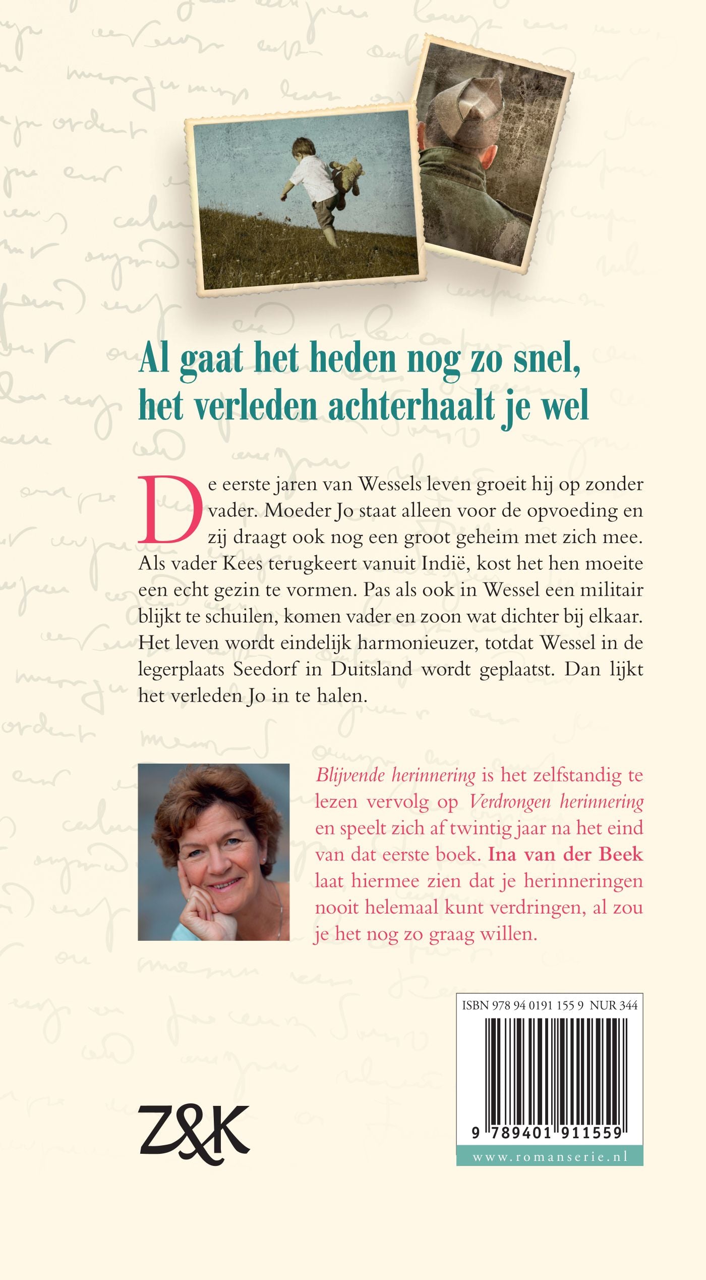 'Blijvende herinnering' van Ina van der Beek is het indrukwekkende slotdeel van een oorlogstweeluik. Hoofdpersoon Jo probeert door te gaan met het leven na de oorlog, maar dat lukt niet als de oorlog nog overal om haar heen is. Haar man Kees is zelfs gelegerd in Indië. Gek genoeg is het moment waarop hij terugkeert juist het moment waarop het pas echt lastig wordt om de herinnering te verdringen - en waarop het dagelijks leven simpelweg voortzetten onmogelijk wordt. Na 'Verdrongen herinnering' is 'Blijvende herinnering' van Ina van der Beek opnieuw een aangrijpende roman.
