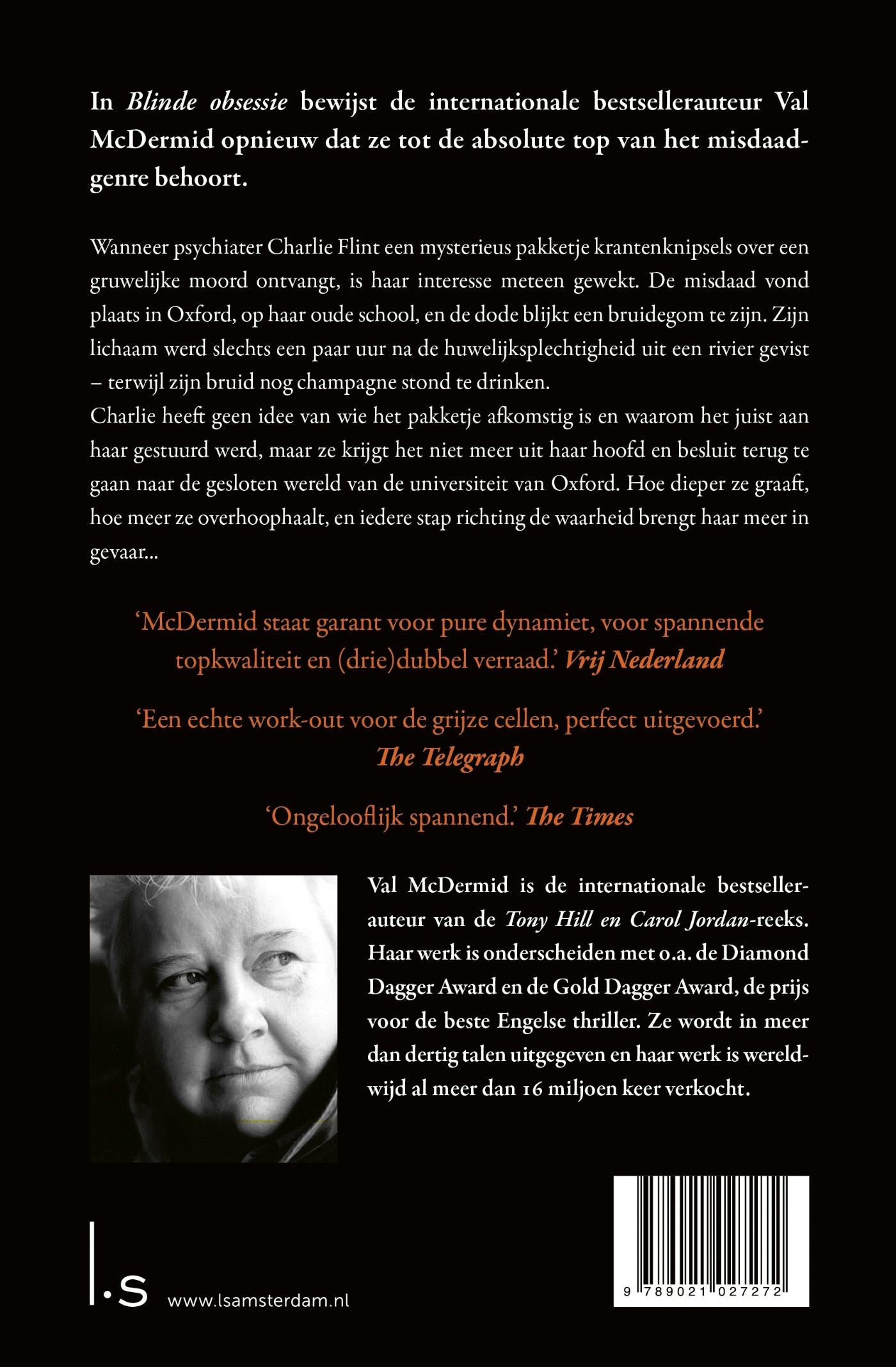 In Blinde obsessie van bestsellerauteur Val McDermid ontvangt psychiater Charlie Flint een mysterieus pakketje krantenknipsels over een gruwelijke moord. Haar interesse is meteen gewekt: de misdaad vond plaats in Oxford, op haar oude school, en betreft een bruidegom. Zijn toegetakelde lichaam werd slechts een paar uur na de huwelijksplechtigheid gevonden – terwijl zijn bruid nog champagne stond te drinken.
