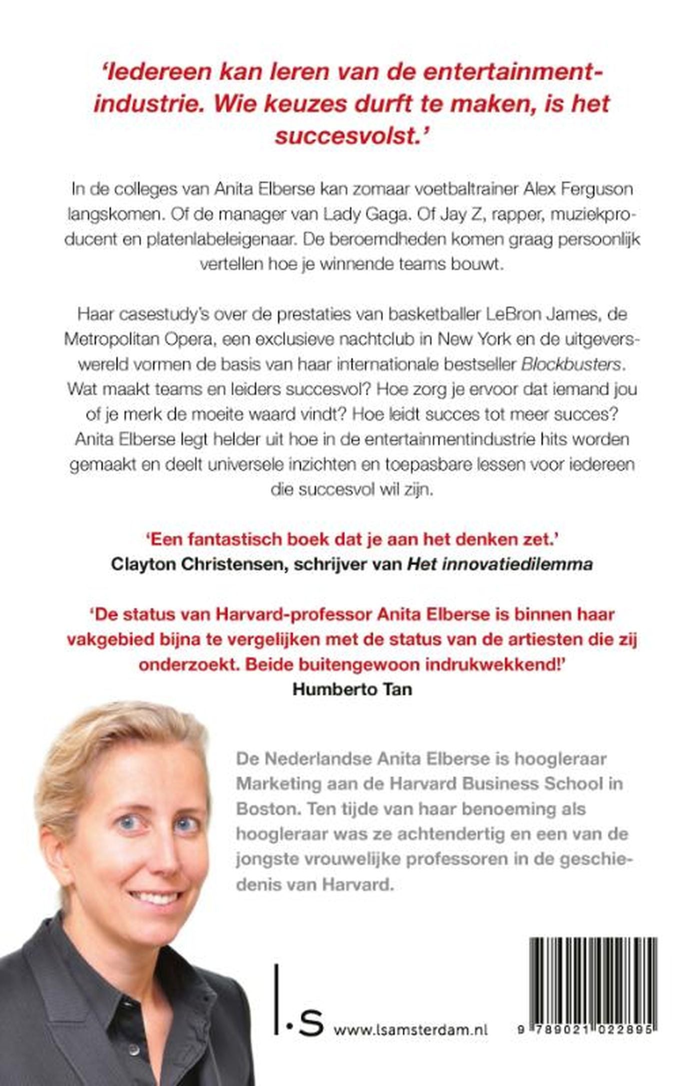 Wat maakt teams en leiders succesvol? Hoe zorg je ervoor dat iemand jou of je merk de moeite waard vindt? Hoe leidt succes tot meer succes? Anita Elberse legt helder uit hoe in de entertainmentindustrie hits worden gemaakt en deelt universele inzichten en toepasbare lessen voor iedereen die succesvol wil zijn.