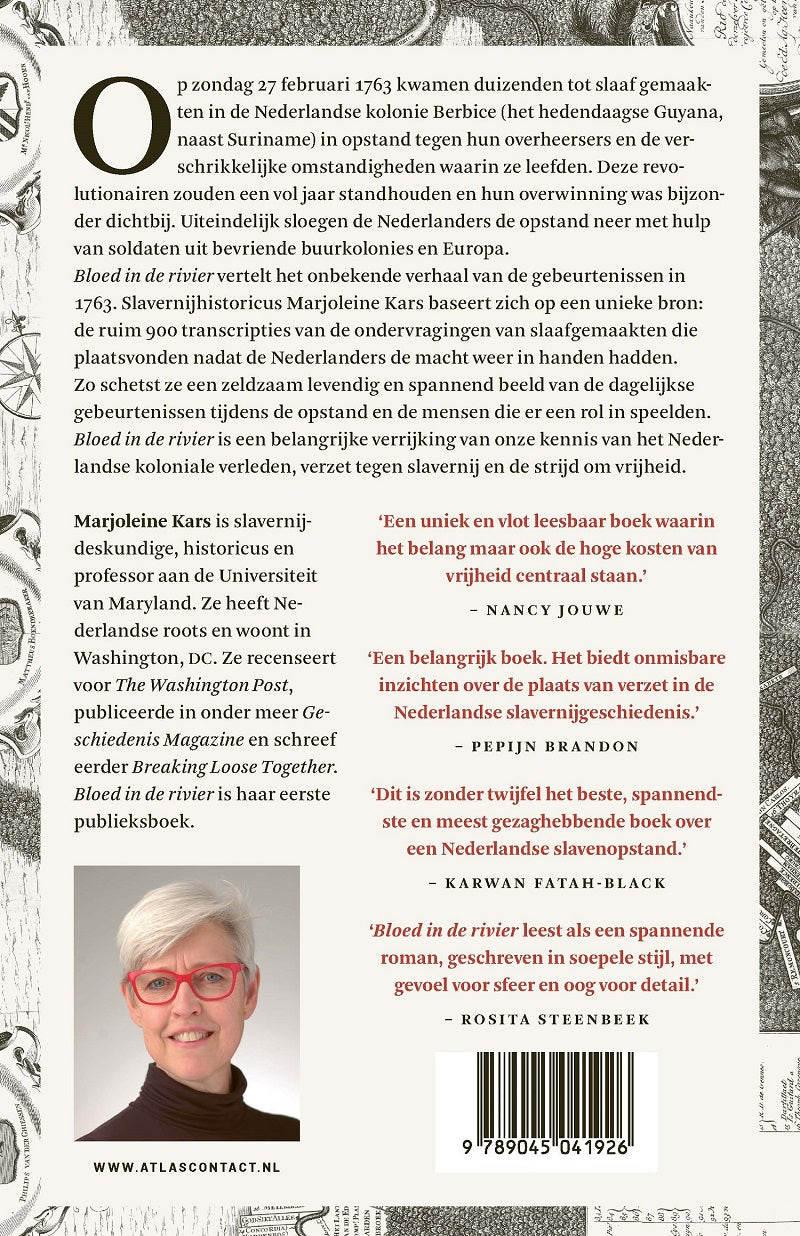 In ‘Bloed in de rivier’ vertelt Marjoleine Kars over een onbekend stuk koloniale geschiedenis. Op zondag 27 februari 1763 kwamen duizenden tot slaaf gemaakten in de Nederlandse kolonie Berbice (het hedendaagse Guyana, naast Suriname) in opstand tegen hun overheersers en de verschrikkelijke omstandigheden waarin ze leefden. Deze revolutionairen zouden een vol jaar standhouden en hun overwinning was bijzonder dichtbij. Uiteindelijk sloegen de Nederlanders de opstand neer met hulp van soldaten uit bevriende buurkolonies en Europa.