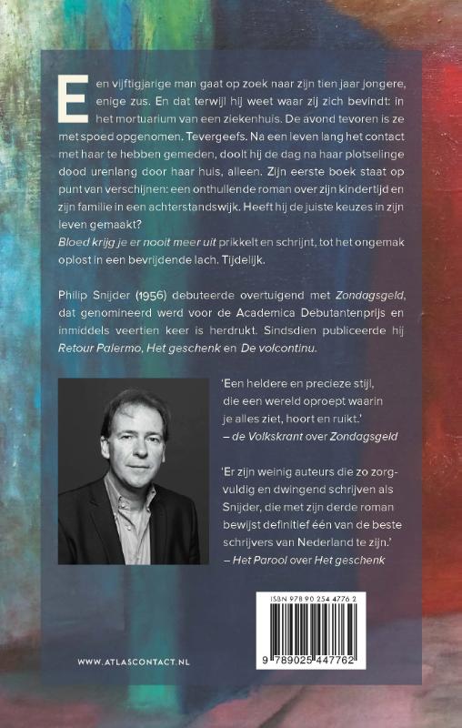 In 'Bloed krijg je er nooit meer uit' van Philip Snijder gaat een vijftigjarige man op zoek naar zijn tien jaar jongere, enige zus. En dat terwijl hij toch weet waar zij zich bevindt: in het mortuarium van een ziekenhuis. De vorige avond is ze met spoed opgenomen. Tevergeefs. De dag na haar plotselinge dood doolt hij urenlang door haar huis, alleen, zoals hij dat tegelijkertijd doet in zijn herinneringen - aan haar, en aan zijn eigen zelfzuchtige afzijdigheid bij haar ondergang. Ondertussen staat zijn eerste boek op punt van uitkomen: een onthullende roman over zijn kindertijd en zijn familie in een achterbuurt. 'Bloed krijg je er nooit meer uit' prikkelt en schrijnt zoals het treurigstemmende leven van zijn zus schuurt, tot het ongemak oplost in een bevrijdende lach. Tijdelijk.